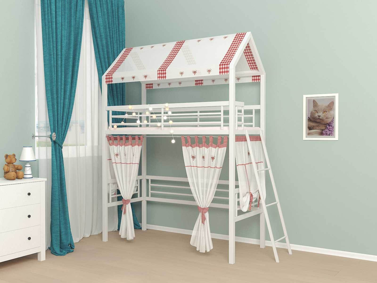 Модель подходит как для девочки, так и для мальчика. Наличие текстиля для кровати-домика позволяет создать фальш-стену. Над вторым ярусом, над спальным местом, расположилась крыша. Она может быть выполнена в форме дворцовой башни. А свободную зону на первом ярусе заполняют нужными и интересными для детей предметами ─ полочками, зеркалами, качелями, навесным спортивным снаряжением, предметами, которые имитируют домашнюю утварь.