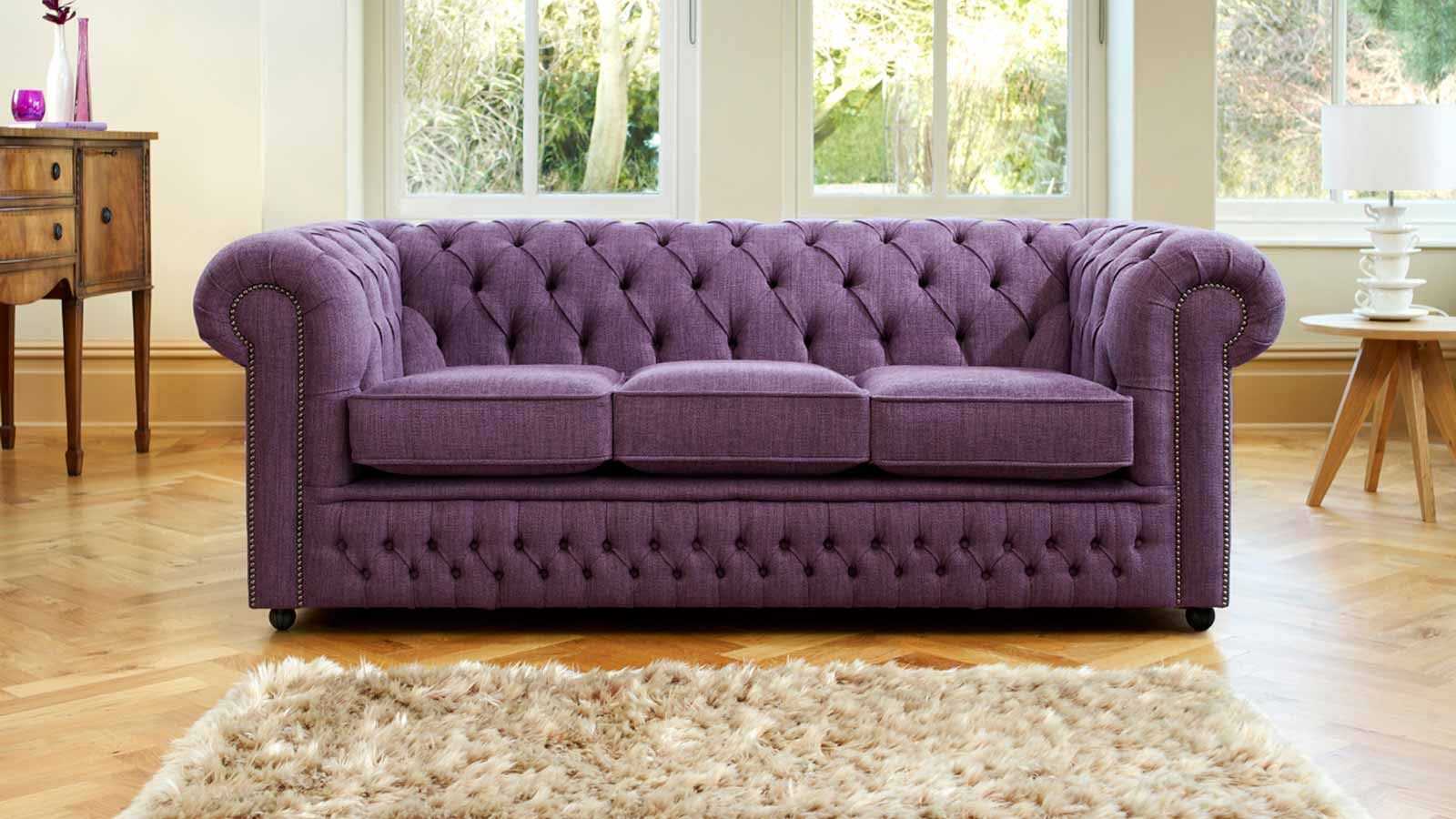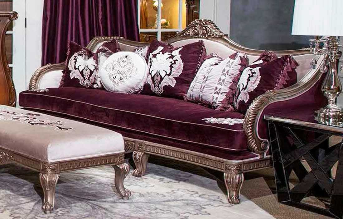 - Фиолетовый диван в классическом стиле будет прекрасно выглядеть, если дополнить интерьер комнаты лавандовыми портьерами на окнах.