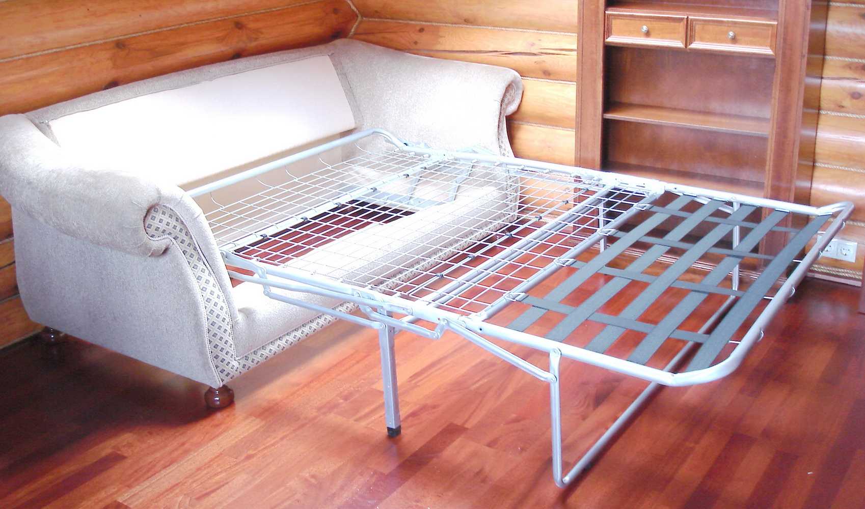- Металлический каркас, внутри которого закреплен прочный синтетический тент, как вариант – проволочная сетка. Тентовая конструкция напоминает раскладушки советского производства. Основание с проволочной сеткой похоже на панцирные (пружинные) кровати тех же времен. Оба варианта имеют один существенный недостаток: со временем поверхность теряет упругость, делая невозможным комфортное пребывание на диване. Такие опоры не выдерживают нагрузку более 90 кг, даже в течение кратковременного пользования. Несмотря на самые демократичные цены среди возможных модификаций, сейчас диваны с таким типом оснований практически не выпускаются.