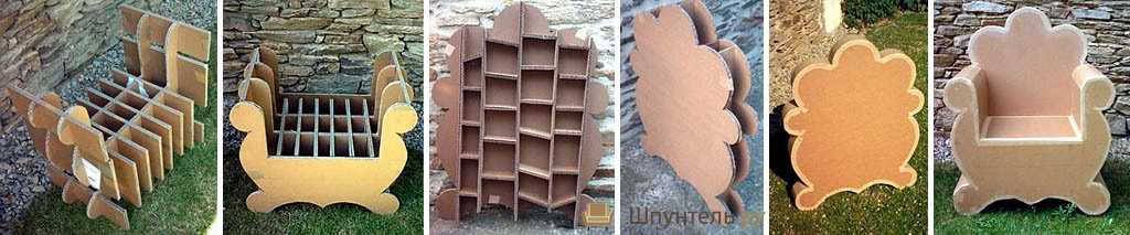 Во-вторых, кресла из картона. Упаковочный картон с внутренним гофром материал замечательный во многих отношениях и находит самое широкое применение. Но не для кресел. В принципе, соорудить кресло из картона не так уж сложно, см. рис., и его общая прочность будет весьма высокой. Но – увы! – даже упрочненный любым способом картон легко сминается с торца и сиденье кресла очень скоро просядет. А толчок чем угодно твердым, хоть пылесосом, оставит неустранимую вмятину.