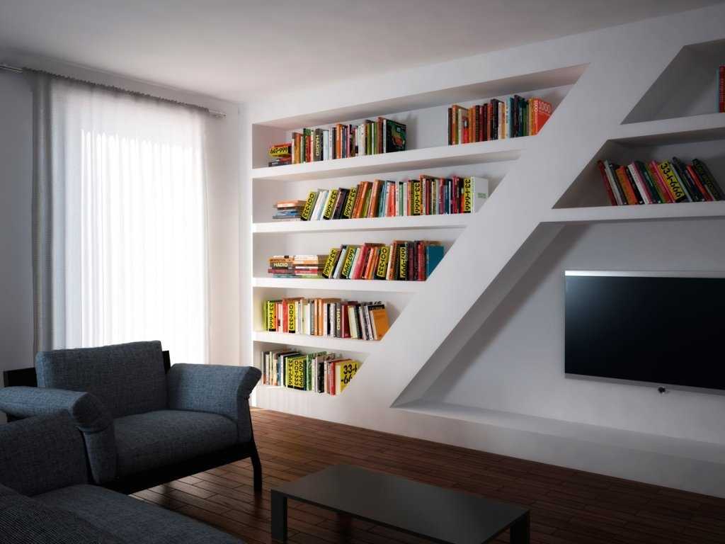Из гипсокартона также можно сделать шкаф для книг.