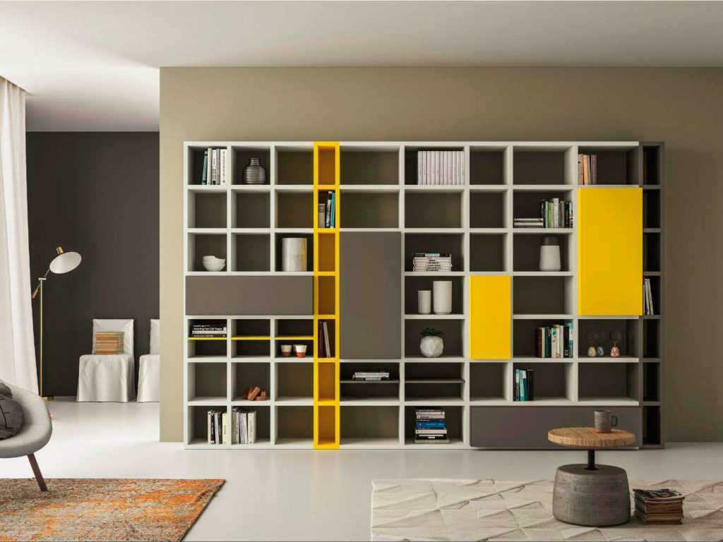 Библиотека в гостиной, расположенная перед диваном, с полками вокруг телевизора, является, пожалуй, наиболее распространенным устройством, очень часто используемым, особенно в многоквартирных домах. Эта компоновка представляет собой комбинацию корпусов со шкафами или полками, где книги могут быть оформлены в классическом стиле или с различным чередованием декораций. Вариант этой библиотеки — расположение нескольких простых двойных полок разной длины, расположенных асимметрично на доступном пространстве, с декоративными элементами, также перемежающимися.