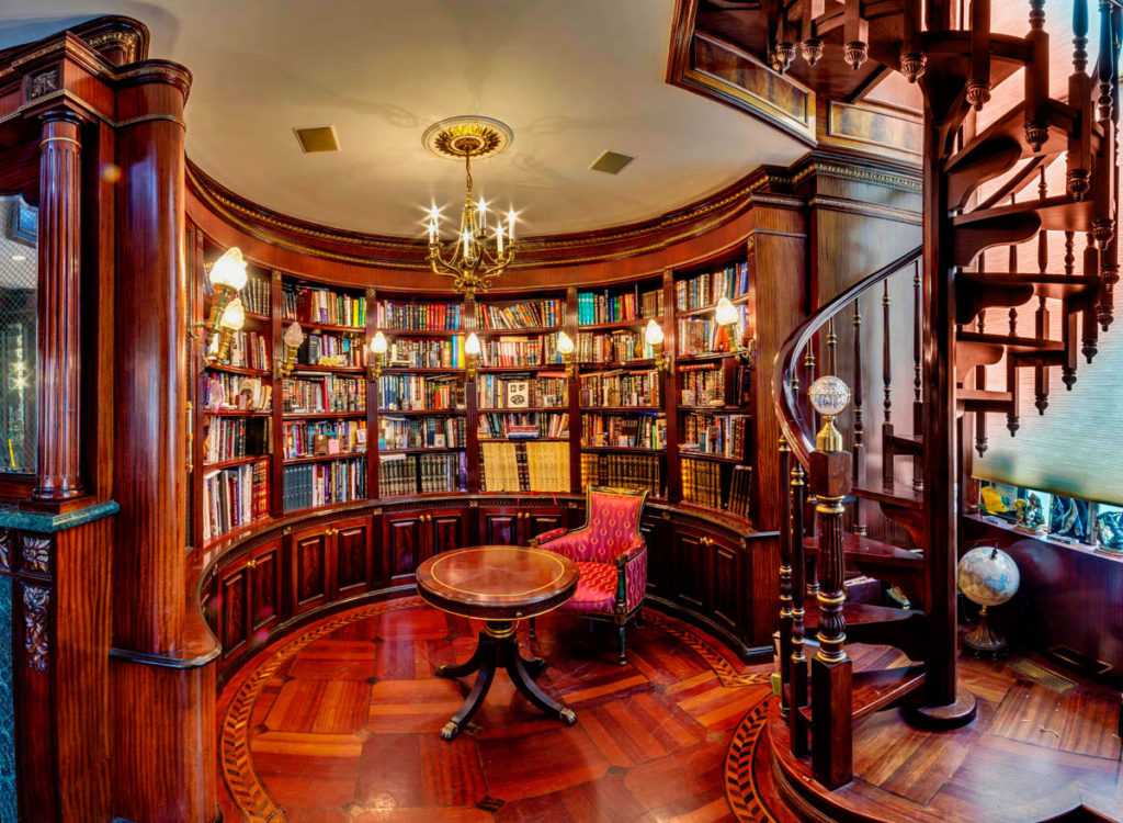 Классика размещения книжных шкафов и стеллажей. Тематика литературы, размещённой в подобном помещении, должна быть серьёзной – это подчеркнёт статус хозяина дома. В то же время, издания, расставленные вдоль одной из стен дома или в угловых книжных шкафах библиотеки, добавят уюта без излишней «показухи». Для подобных помещений обычно приобретаются стеллажи из более дорогих материалов. Чаще всего, это книжные шкафы для домашней библиотеки из массива.
