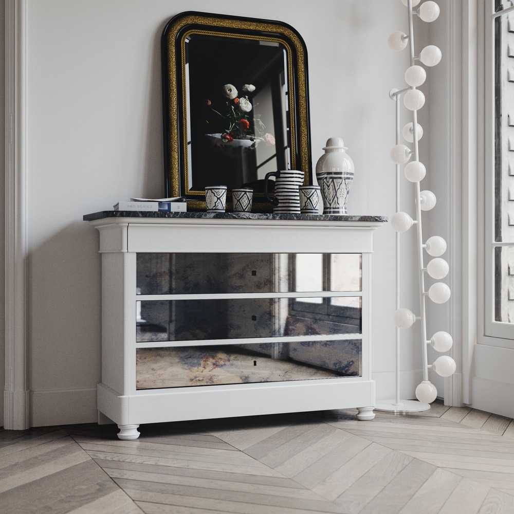 Комод по функциональности заменяет несколько предметов мебели, а вместе с зеркалом составляет элегантный вариант для классических интерьеров современного стиля. Комод представляет собой невысокий предмет мебели с выдвижными ящиками, а зеркало занимает одну треть высоты модели. Производители представляют разные варианты: