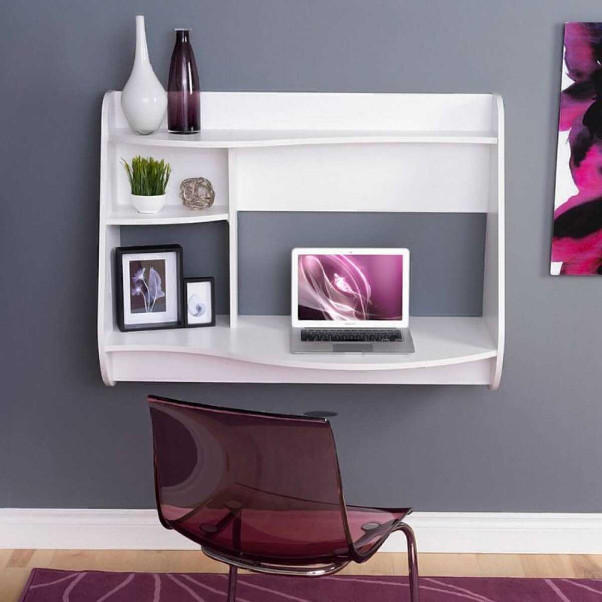 - Если комната небольшая, имеет смысл выбрать встроенный или откидной стол для работы. Первый вариант обычно сочетается с другой мебелью, или размещается в нише. Второй вариант имеет крепление к стене, подъем производят на мебельных петлях, вручную или с помощью механизма (газлифт, пружины).