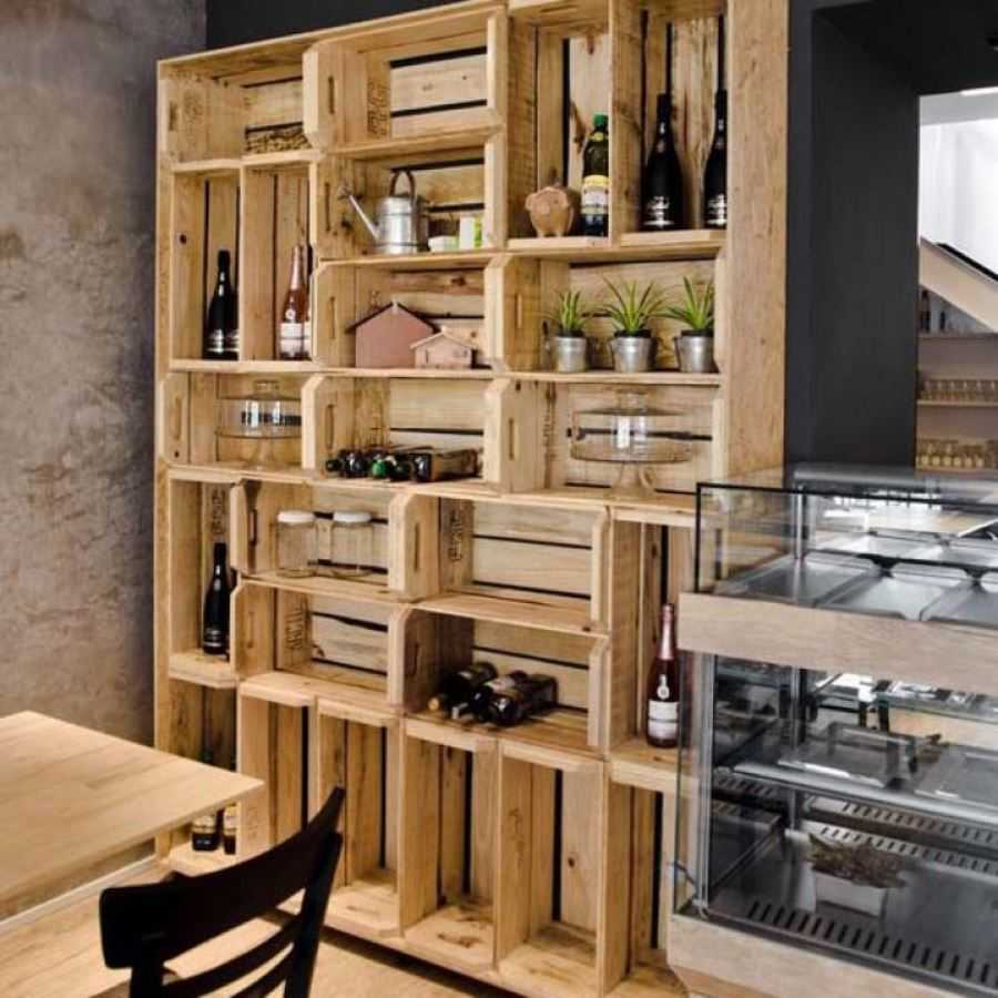 Чтобы получить стеллаж, необходимо удалить доски из поддонов, и вставить на их место ящики из фанеры. Затем шкафчик окрашивается и декорируется по предпочтению мастера