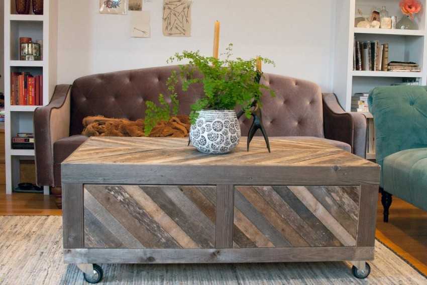 Важно затем разместить их таким образом, чтобы исчезли щели. Зафиксировать новую конструкцию можно гвоздями. Дальше будущий столик шлифуется наждачной бумагой до гладкости поверхностей, окрашивается