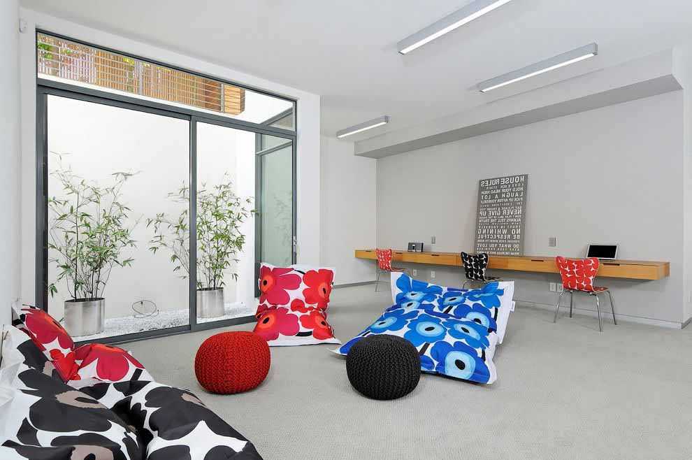 В детских комнатах бескаркасная мебель смотрится гармоничнее всего. Школьники очень много сидят за рабочим столом, сильно нагружая позвоночный столб. Разгружает его смена положения, и удобнее всего сделать это в детском кресле-мешке. Вписать такую мебель в интерьер несложно. И стиль, который был выбран, не имеет особого значения. Достаточно правильно подобрать цветовое решение для чехла, и кресло легко дополнит любой дизайн.