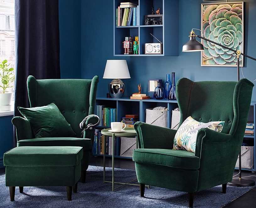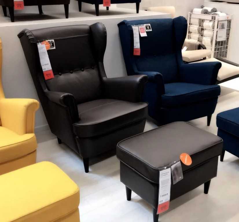 Цвета кресел Ikea позволяют каждому владельцу дома или квартиры подобрать оптимальное решение для своего интерьера. Гамма оттенков довольно разнообразна. Можно найти оранжевое, желтое, горчичное, серое, синее, красное, желтое, белое кресло в различных вариантах обивки. В зависимости от сезона в каталоге компании появляются висячие модели в форме яйца. Дети приходят в восторг от вращающегося «ПС Лемёск», выполненного в красно-белой гамме, и специальной версии «Страндмон» – настоящего хита продаж.