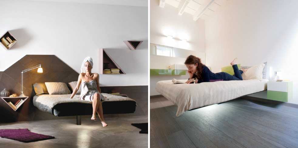 Визуально создается впечатление, что кровать висит в воздухе. Это возможно благодаря отсутствию видимых опор, что далеко не всегда соответствует действительности. Парящие спальные места обычно располагают изголовьем вплотную к одной из стен, в которую вмонтированы несущие элементы конструкции, расположенные таким образом, что увидеть их достаточно сложно.