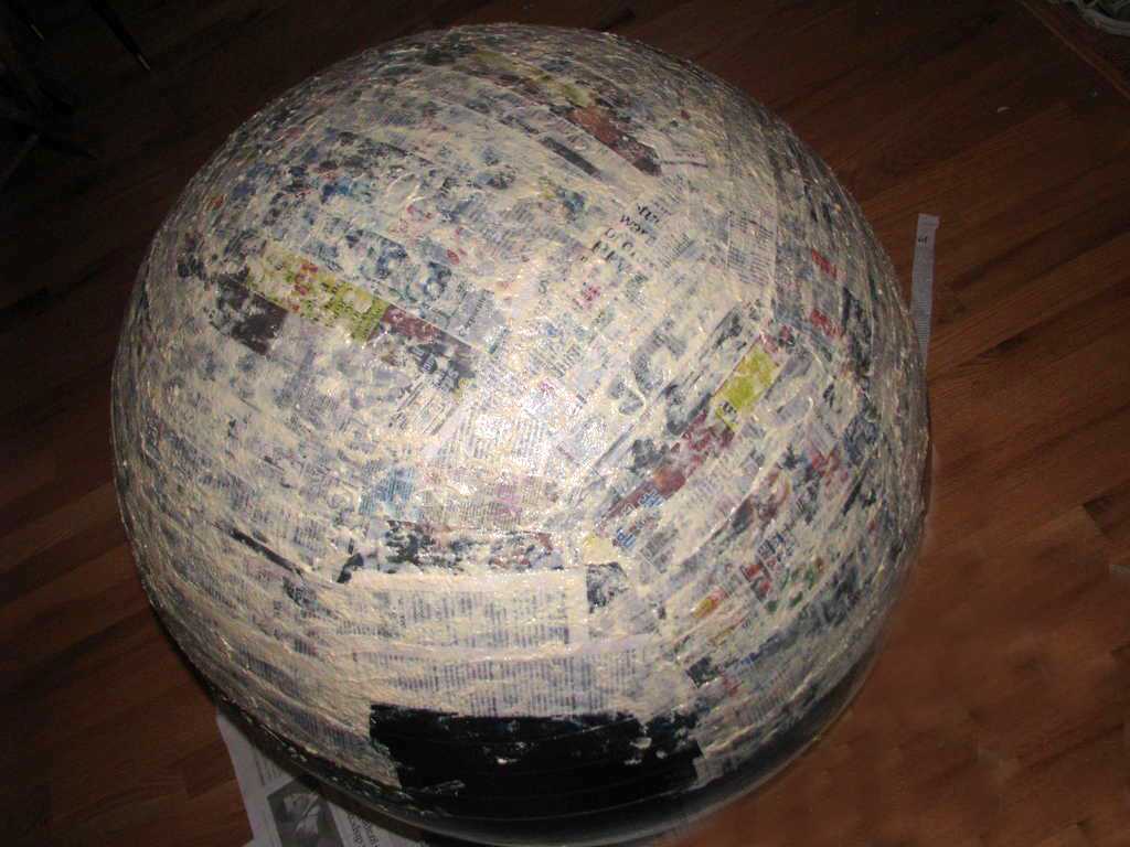 6. Нанесите клейстер на обе стороны каждой полоски, приклейте их на мяч параллельно друг другу. Поверх них наклейте еще один слой полосок перпендикулярно первым.