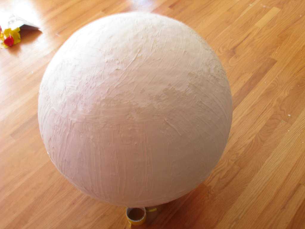 7. Когда покроете весь мяч (до скотча) двумя слоями бумажных полосок, дайте ему просохнуть 12 часов. Повторите 6-ой пункт минимум пять раз (если кресло предназначено для животного). В идеале нужно нанести хотя бы 10 двойных слоев папье-маше. После каждого слоя нужно оставлять изделие сохнуть на 12 часов.