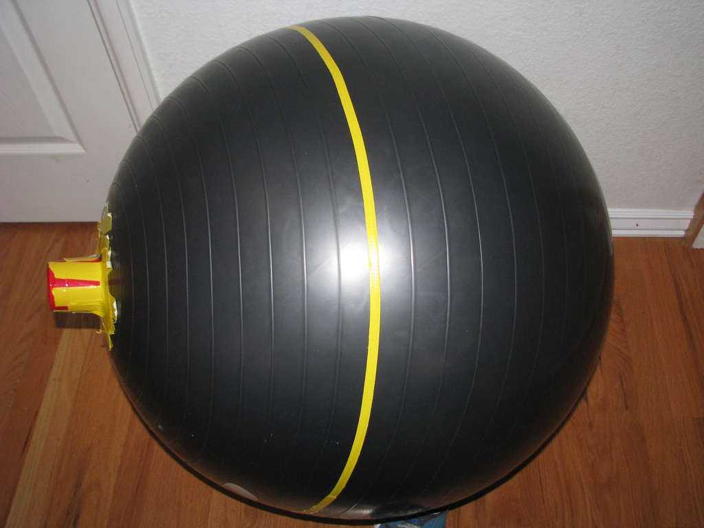 2. Наклейте скотч вокруг мяча, чтобы определить границы папье-маше. Скотч нужно клеить, немного сместив от линии центрального сечения.