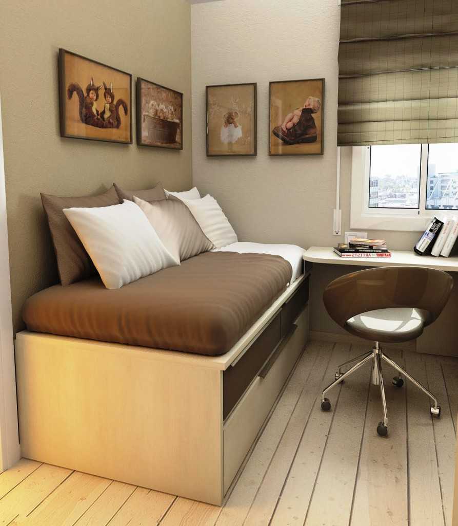 Еще одним удобным вариантом установки в небольшой комнате станет угловой диван. Он очень компактно смотрится в собранном виде. Оборудован выкатным механизмом, что делает его широким спальным местом. Часто оснащен ящиками, которые очень удобно использовать для хранения белья или других вещей.
