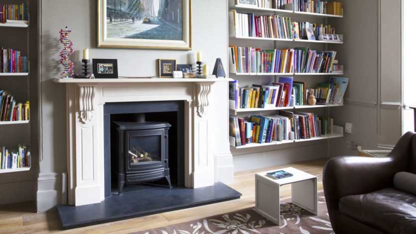 Если вы придерживаетесь классики, то можете встроить небольшой шкаф в стену, прилегающую к камину. Помните, что в этом случае изделие не должно выделяться и брать на себя акцентную роль. Оно всего лишь дополняет собой выбранную концепцию.