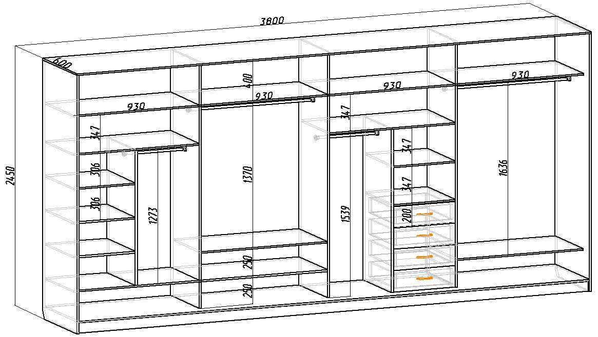 - ширина шкафа купе тоже ограничена размерами листа ДСП. Для ее увеличения в чертеж добавляют перегородки. При этом готовая конструкция будет состоять из двух или более модулей;