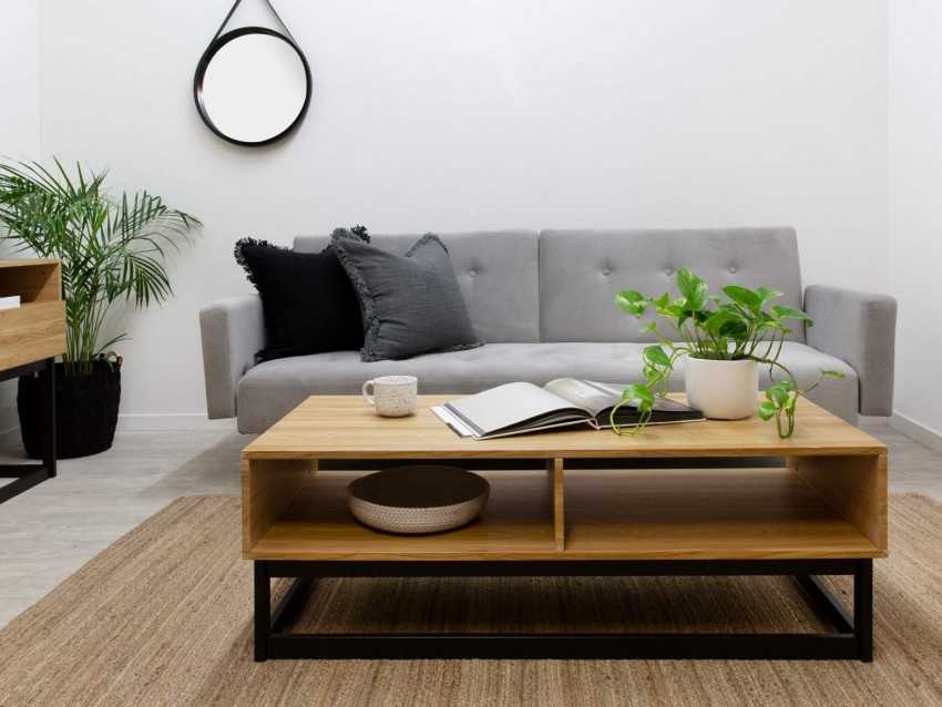 - Придиванный столик. Маленький по размеру, но на него можно поставить даже ноутбук, хотя удобнее расположить на нем пару бокалов вина или сока.