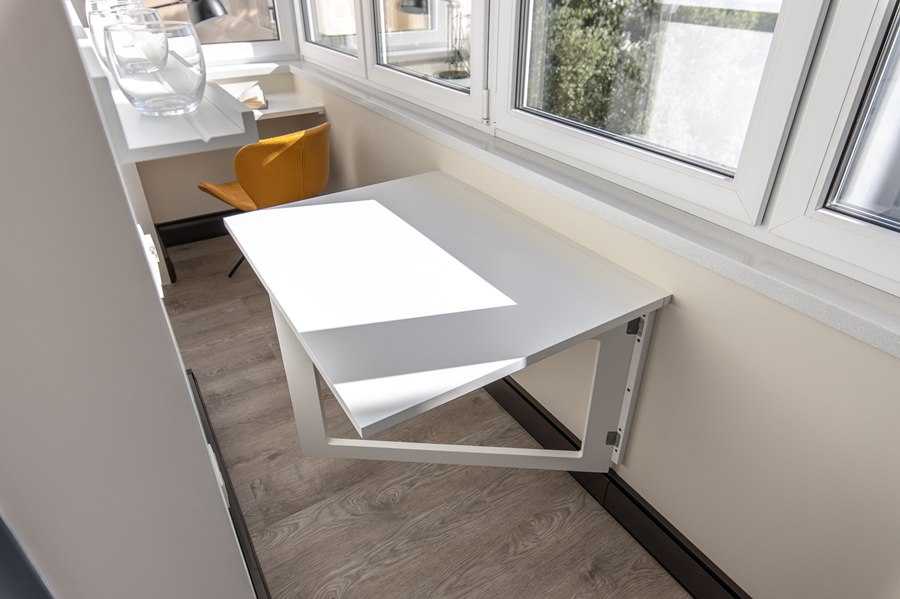 - На балконе или лоджии откидывающиеся столики преимущественно крепятся в боковой части, чтобы оставить свободным вход. Однако если эту мебель будут использовать несколько человек, лучше вмонтировать ее в длинную часть балкона — так можно будет расставить стулья с трех сторон.