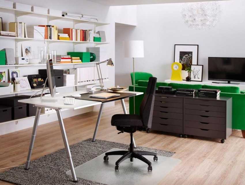 Зеленый в мебельных изделиях используется реже всего. Природный оттенок расслабляюще действует на психику, что не всегда уместно в рабочей зоне. Травяной цвет чаще встречается в сочетании с МДФ или ДСП, дуэт с пластиковыми изделиями – редкое явление.