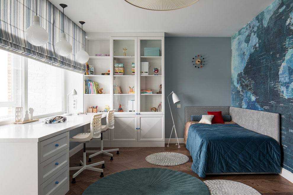 Прямоугольная детская комната или узкой формы требует расположения стола для двоих вдоль стены