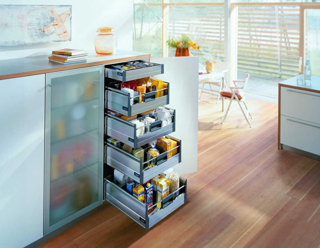 Организация мест для хранения в кухнях без навесных шкафов ↑