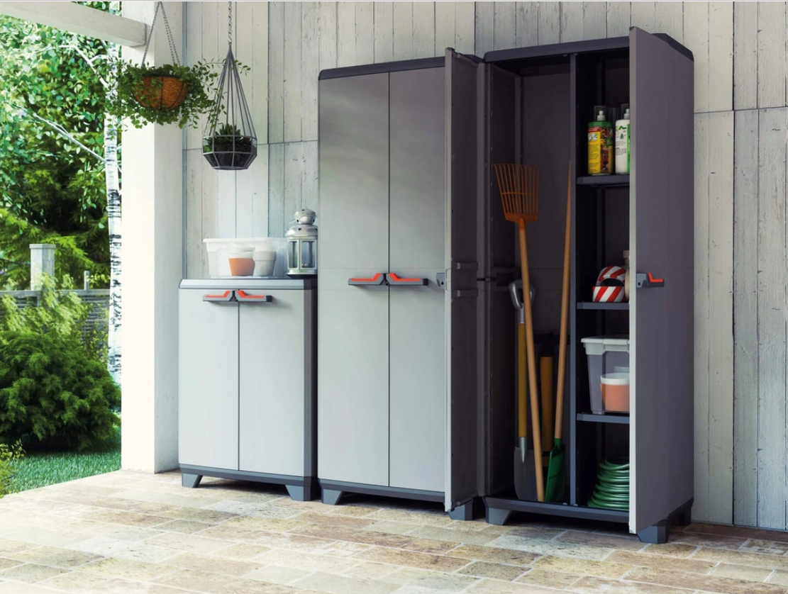 - Устойчивые ко внешнему воздействию шкафы подойдут для улицы или балконов. Для хранения садового инвентаря стоит выбрать конструкции с дверцами, так влагостойкий пластик защитит инструменты от осадков. Маленькое пространство лоджии можно дополнить встроенным шкафчиком. При необходимости он может занимать всю высоту балкона либо быть не выше парапета.