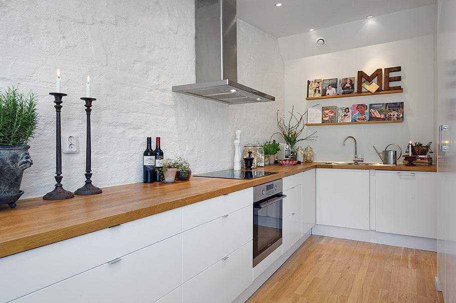 Навесные конструкции из натурального дерева на белой стене в кухне без верхних навесных шкафов