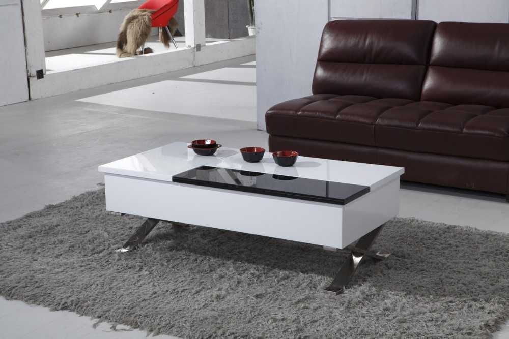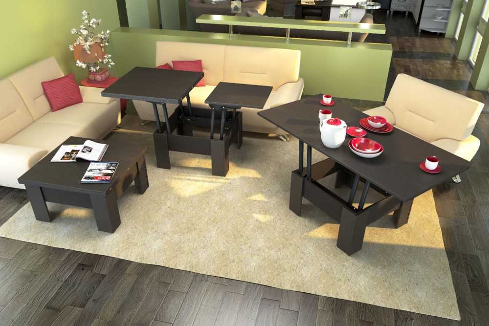 Такие современные конструкции можно легко превратить в просторные и удобные столешницы, если вам необходимо в кратчайшие сроки сформировать уютный уголок для дружеских посиделок. Зачастую журнальные столики располагают перед мягким уголком (чуть реже – за ним).