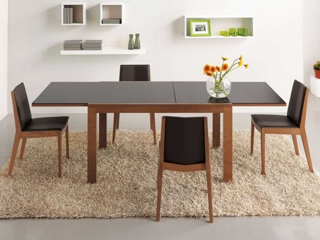 - Прямоугольная столешница считается оптимальным решением и отлично вписывается как в современные, так в классические стили интерьера. Такие столы актуальны для использования, как в просторных, так и в небольших помещениях. В собранном состоянии они могут уместить до 6 человек, а в разложенном – все 12, что очень удобно для больших компаний.