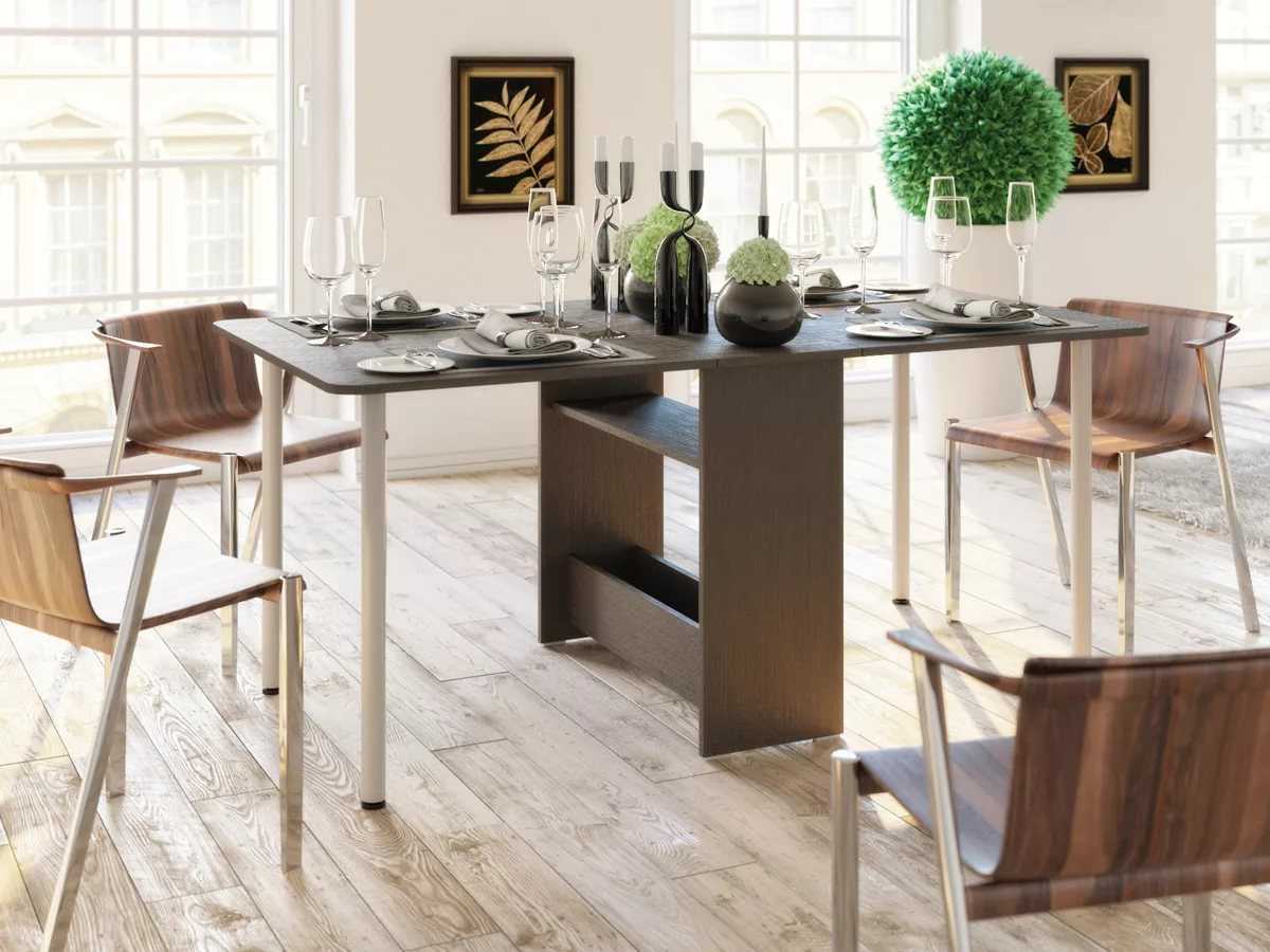 Обеденные «раскладушки» идеально подходят для компактных обеденных зон и кухонь. В первую очередь, такие модели направлены на расширение пространства, чтобы за столом удалось удобно разместиться большому количеству человек.