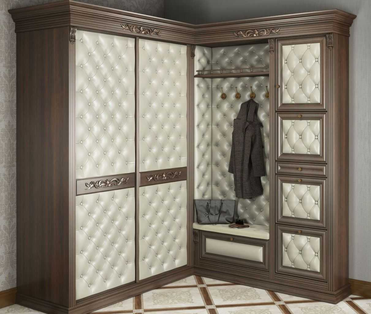 Не менее эффектно выглядят вставки из искусственной кожи. Такой шкаф будет уместен в классическом интерьере, современных стилях. В зависимости от общей цветовой палитры, в которой оформлена прихожая, можно выполнить шкаф в едином цвете либо сделать контрастные вставки.