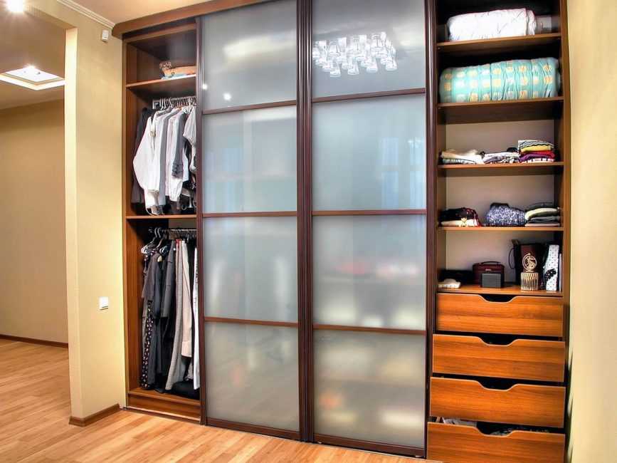 Обычная конструкция предполагает одно большое отделение для размещения вещей на плечиках. Другой отдел более узкий, он разделяется на отсеки будущими полочками. При желании можно выполнить так называемый открытый пенал с левой или правой стороны.