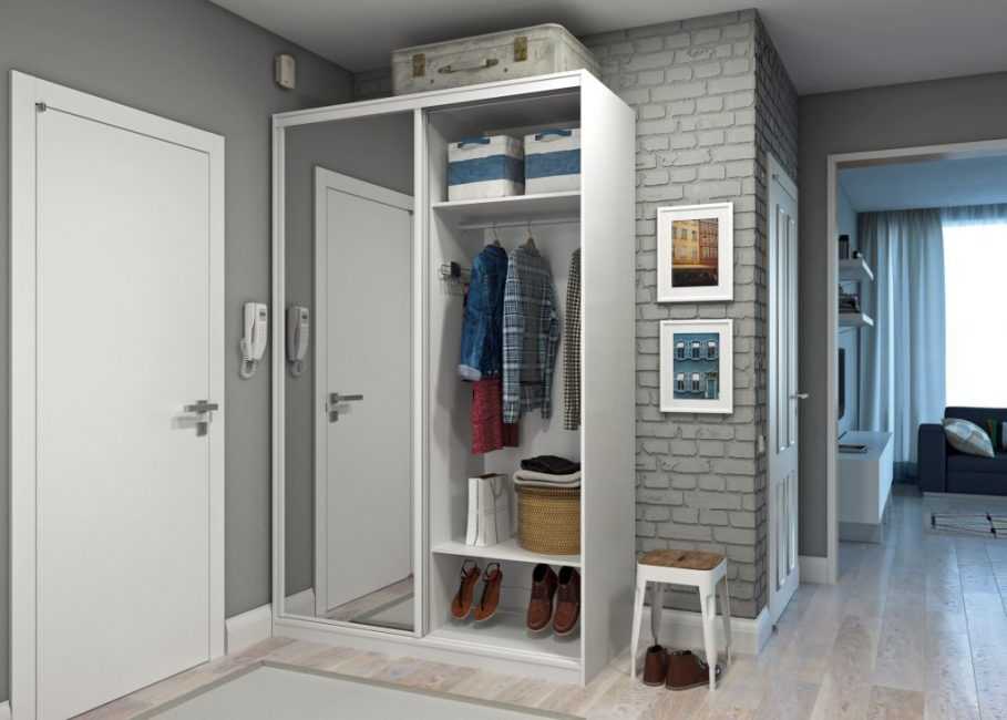 Пример шкафа, одна из дверок которого — зеркальная. Вообще, о зеркальных шкафах-купе для прихожей мы подробнее поговорим чуть ниже, но нельзя не отметить его поразительную вместительность несмотря на довольно скромные размеры.