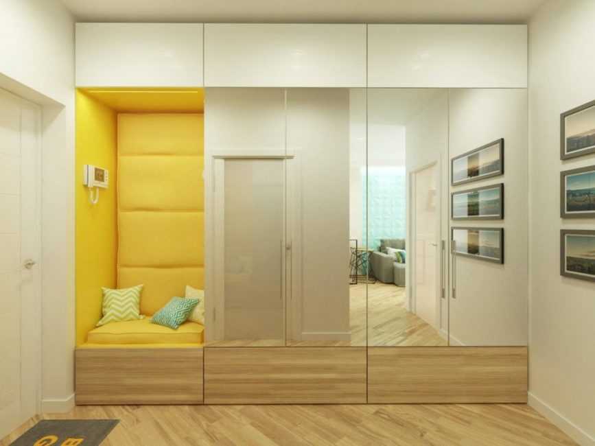 Возможно, один из самых красивых вмонтированных в стену шкафов-купе, за счет которого вся прихожая смотрится необычайно свежо и содержательно.