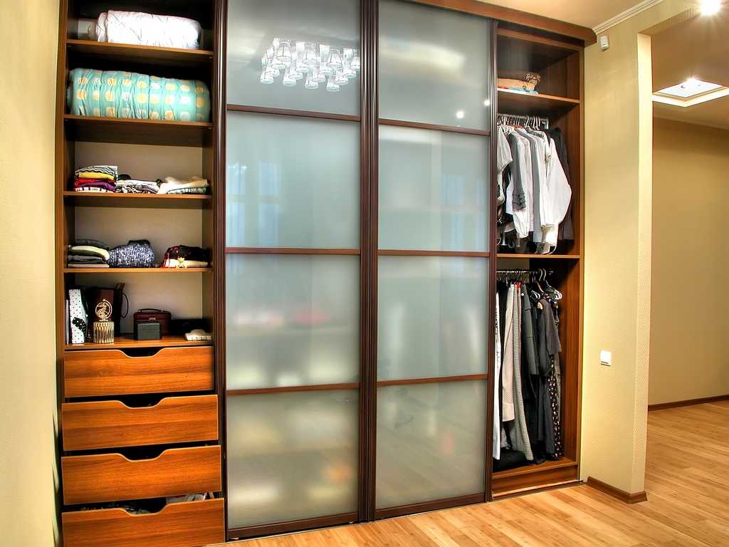 Обычная конструкция предполагает одно большое отделение для размещения вещей на плечиках. Другой отдел более узкий, он разделяется на отсеки будущими полочками. При желании можно выполнить так называемый открытый пенал с левой или правой стороны.