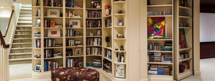 Для зала уместно использование более вместительных, объемных и функциональных стеллажных конструкций, которые оформляют печатными изданиями, предметами искусства, фарфором, хрусталем, памятными вещами или семейными фотографиями.