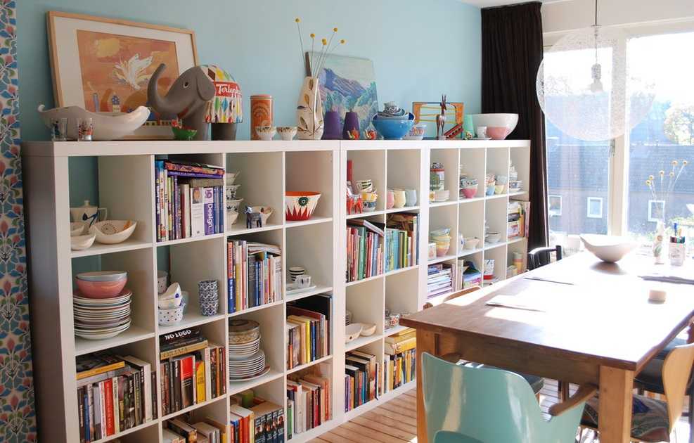Зонирование помещения. С помощью такого предмета мебели можно с легкостью разделить комнату на несколько зон. Стеллаж используется как перегородка, и таким образом разделяются кухня и столовая, спальня и рабочий кабинет, детская комната и игровая зона. Конструкции со стенкой заменяют полноценную стену дома, что не требует создания дополнительных сооружений.