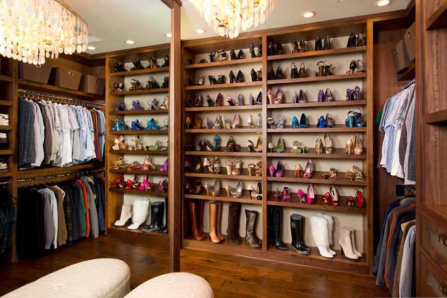 Существует множество вариантов стеллажных систем. Тип конструкции стеллажей, как правило, выбирается исходя из габаритных размеров комнаты, выделенной для устройства гардероба. При наличии возможности обустройства большой гардеробной с отдельными стеллажами для одежды и обуви, лучше выбрать деревянную мебель классического дизайна. Такие стеллажные конструкции бывают как стационарными, так и мобильными. Если гардеробная имеет совсем небольшое пространство внутри, то оптимально подойдут стеллажи, размещенные на стенах.