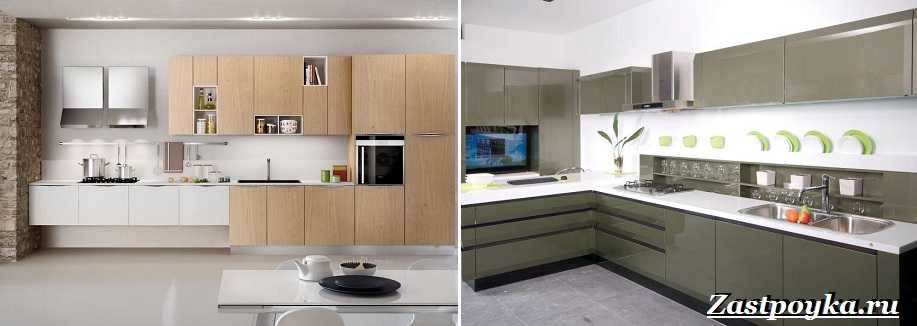 В покрытии кухонных гарнитуров преобладают пластик или МДФ с глянцевой поверхностью. Ручки в кухонной мебели для стиля Модерн в частых случаях вообще отсутствуют. Все открывается путем нажатия на дверцу.