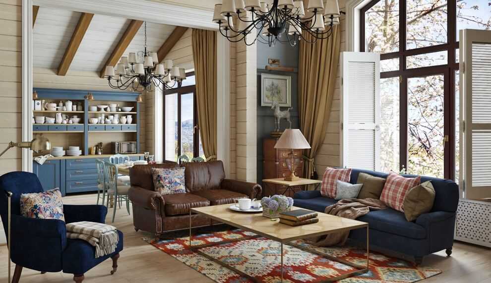 Направление зародилось в богатых загородных домах, а вовсе не в глубинке, как многие считают. Дешевизна и аскетизм не являются определяющими чертами данного стиля. Деревянная отделка стен, пола, открытые балки на потолке, грубая мебель из необработанной древесины – характерные черты кантри. Неотъемлемый атрибут гостиной – камин перед зоной для отдыха с комфортной мягкой мебелью, обитой кожей или грубыми тканями с натуральным составом. Стиль чрезвычайно приближен к природе, поскольку основывается на использовании экологичных материалов и естественной цветовой гаммы.