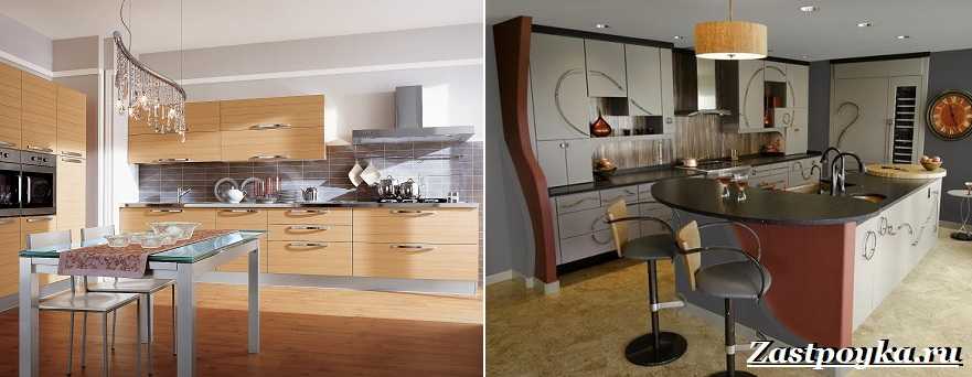 Плавность, изогнутость форм и ассиметричность линий являются основным признаком кухонь в стиле Модерн. Обычную угловую кухню можно преобразить, закруглив угол не только внутрь, но и наружу.