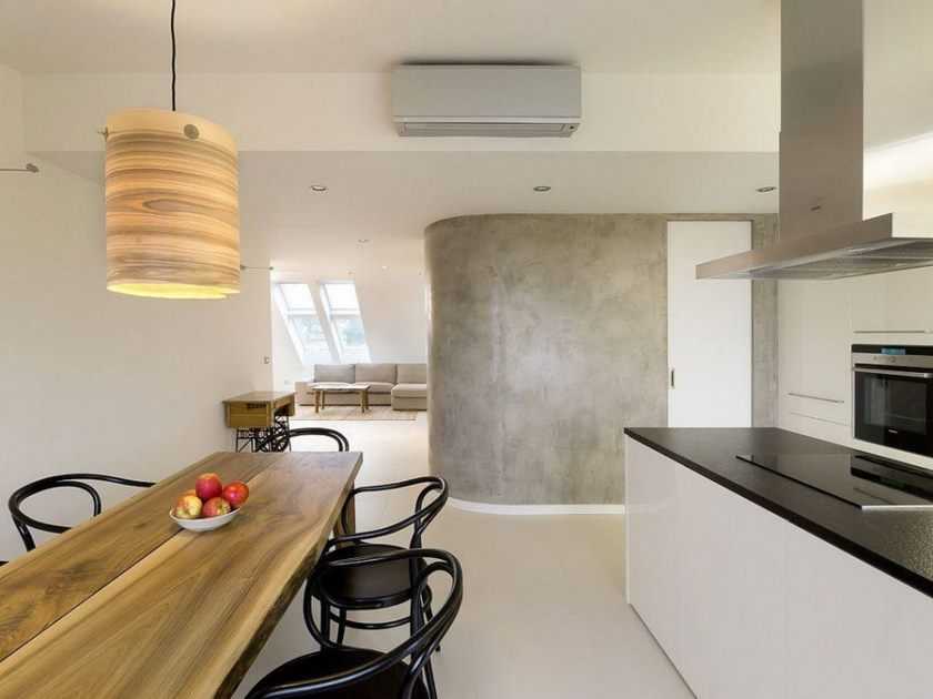Высокие потолки позволяют использовать индустриальные элементы (фермы, балки, обшивку из дерева, вентиляционные трубы). В квартире с низкими потолками можно использовать штукатурку, которая выкрашивается белой краской.