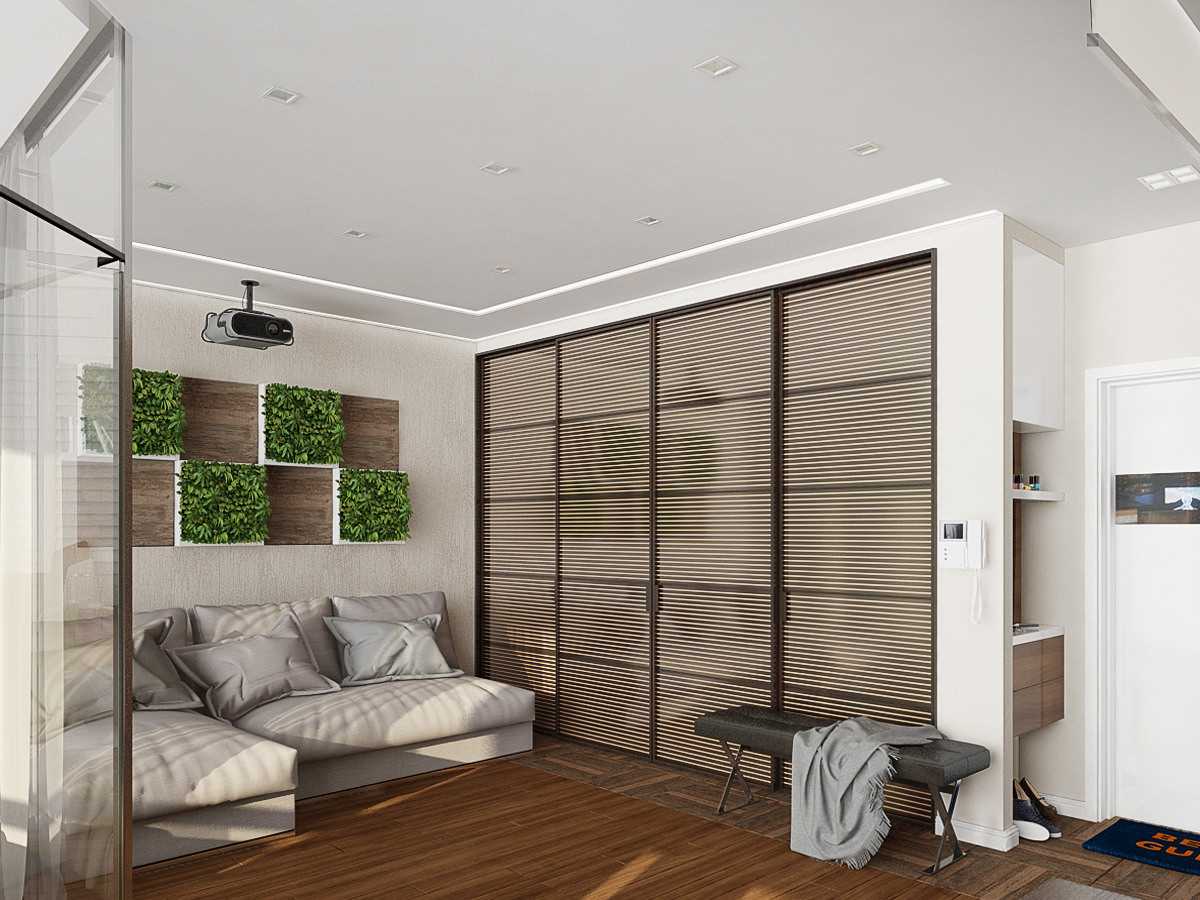 На фото прихожая, отделенная от гостиной с помощью распашного шкафа-перегородки коричневого оттенка.
