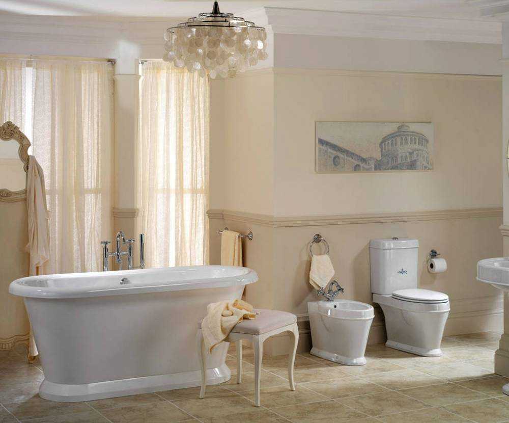 В большой ванной будет уместна крупная люстра. В маленьком помещении достаточно будет пары светильников. Если есть место, можно разместить в ванной комод для принадлежностей в винтажном стиле.