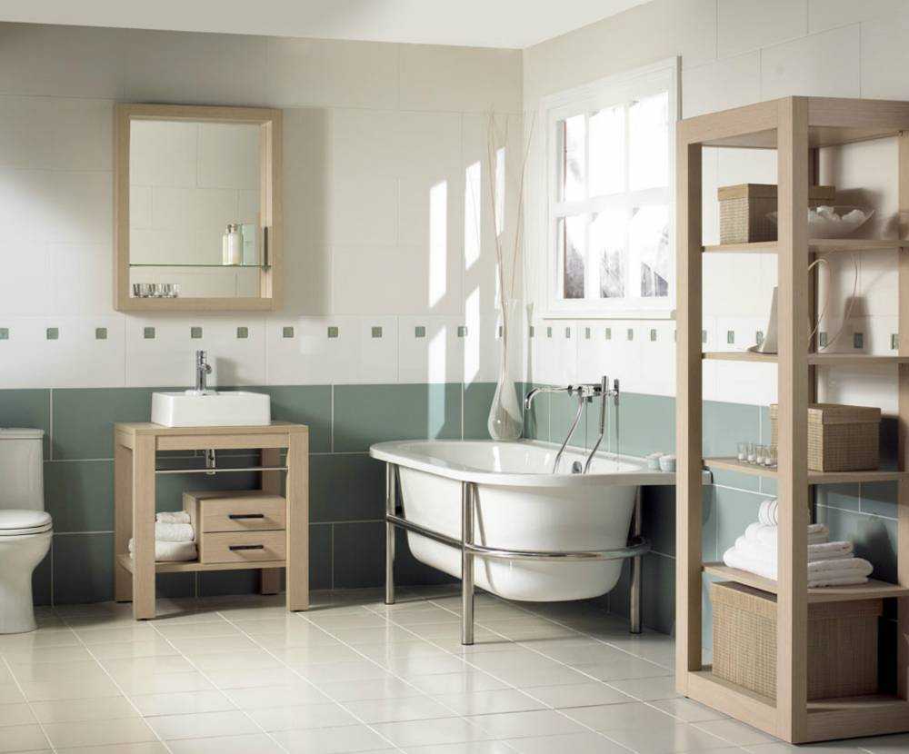 Наиболее популярные оттенки для оформления ванной комнаты — вишневый, золотистый, бежево-коричневый, бронзовый. Для отделки пола используйте плитку крупных размеров, влагостойкий ламинат. Потолок можно оставить белым. Стены также выкладывайте плиткой. Это самый практичный вариант для помещения с повышенной влажностью. На пол устелите небольшие коврики с длинным мягким ворсом.