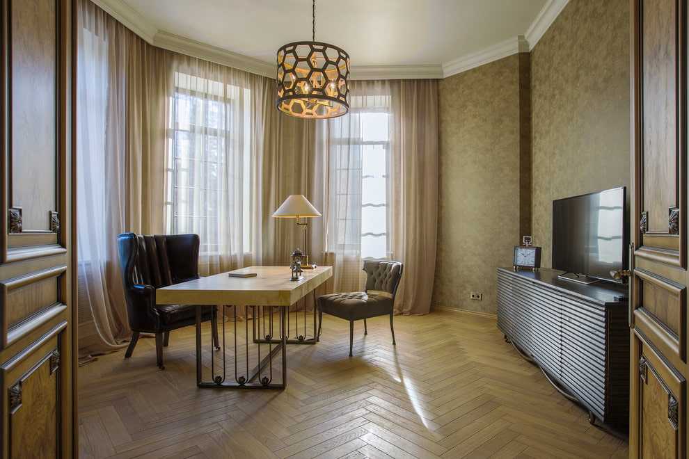 Очень эффектно для кабинета в кабинете будет смотреться классический стиль с резной мебелью, красивыми формами, текстурами и спокойным цветовым решением. Обычно такое помещение используется для проведения встреч, переговоров, чтобы иметь возможность впечатлить гостей и зарекомендовать себя с положительной стороны.