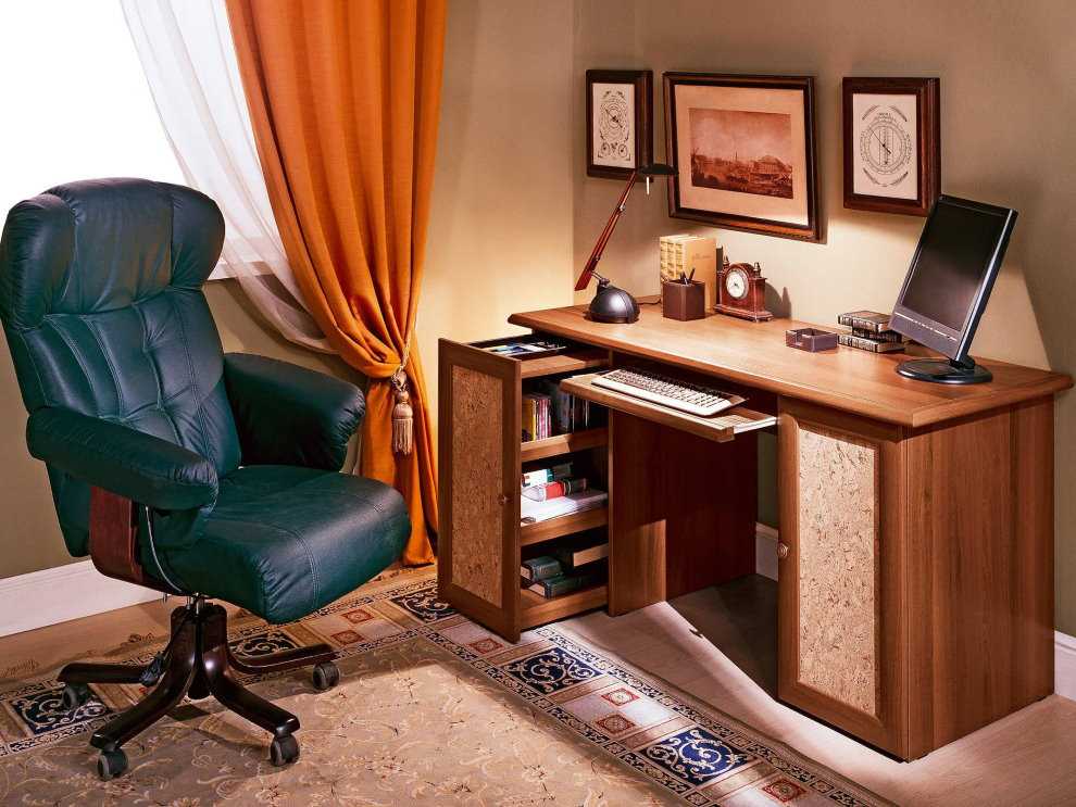 Огромным преимуществом будет встроенный стеллаж под книги или папки. Довольно удобными в использовании и установке в кабинете являются угловые столы, которые подчеркнут общий стиль помещения.