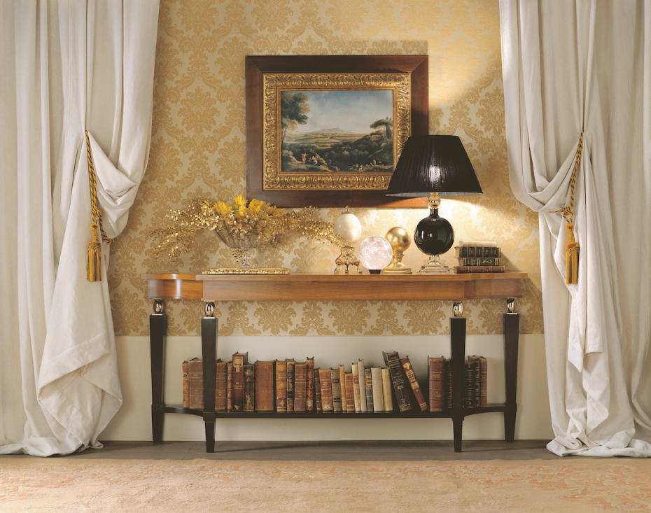 Итальянские модели отличаются особой утонченностью. К примеру, компания Brevio Salotti выпускает изящные консоли в классическом стиле на изогнутых ножках, декорированные резными элементами. Отличительной особенностью продукции бренда является преобладание светлых оттенков и визуальной «воздушности» каждого элемента.