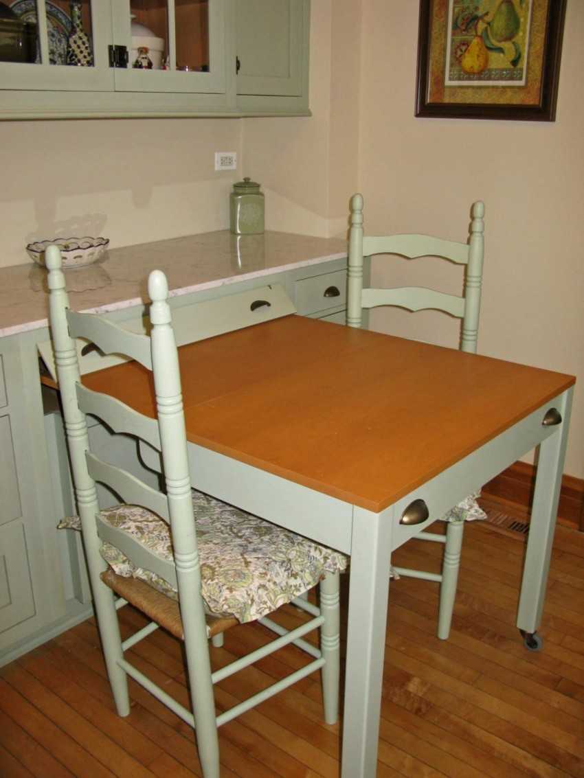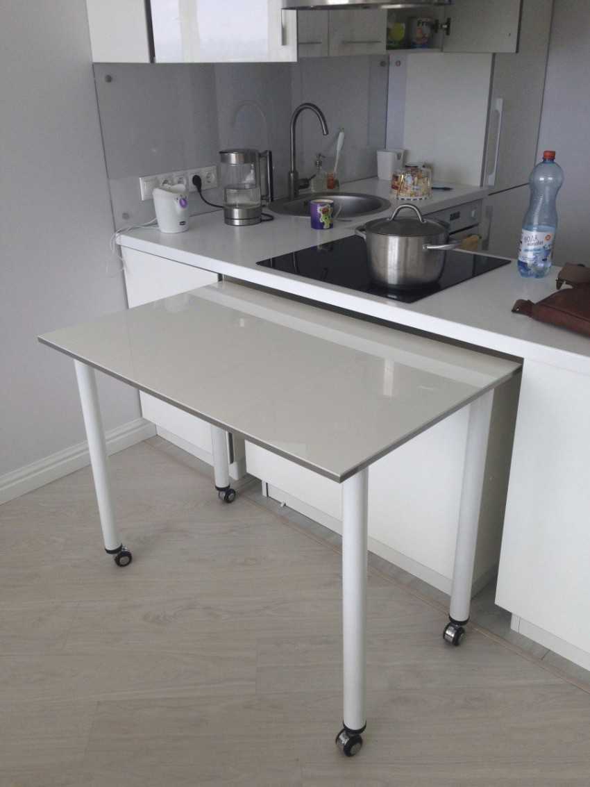 Чтобы увеличить свободное пространство на кухне разумно приобрести выдвижной стол, который значительно освобождает место для более важной мебели. Как правило, он выполняет несколько функций: