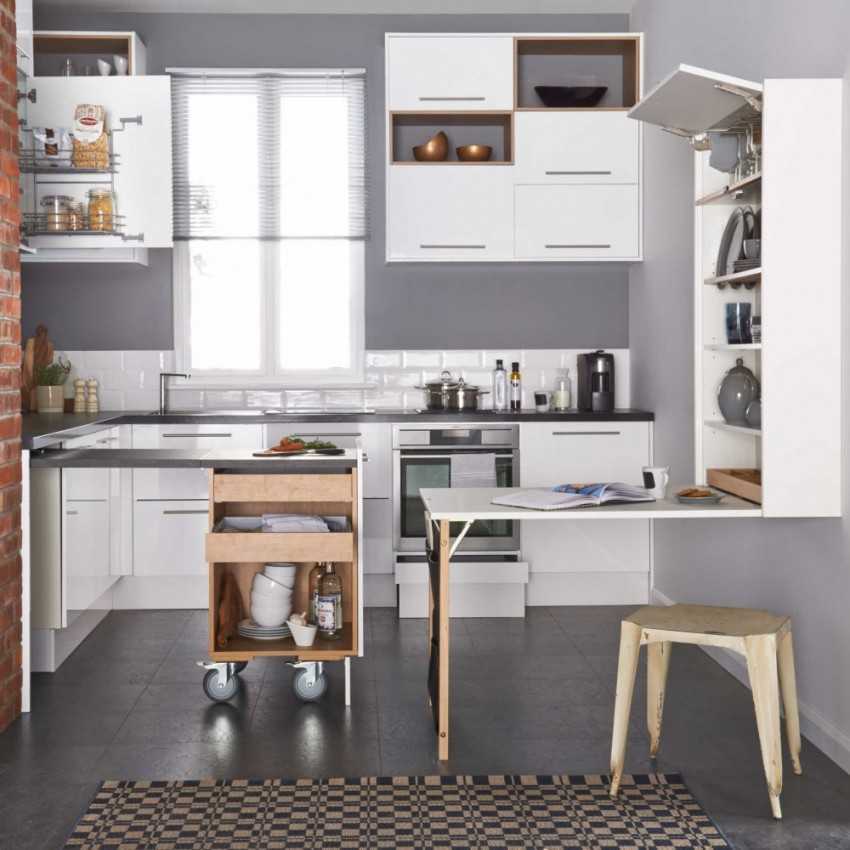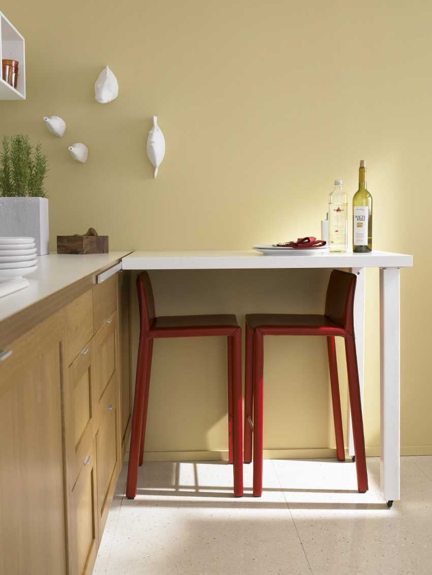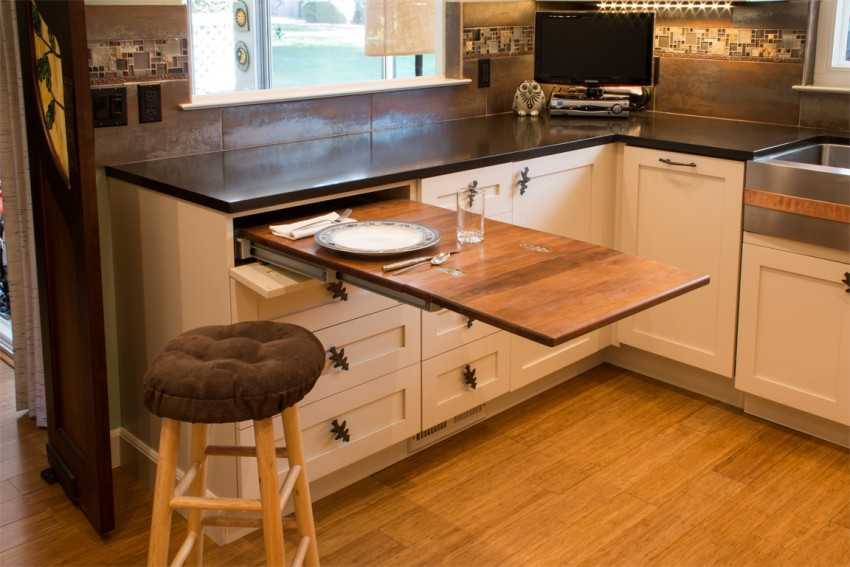 Откидная столешница на кухню – это прекрасный вариант не только для маленьких помещений. Такой столик можно сделать своими руками. Для этого не потребуются особые навыки, а кухня со встроенным столом будет смотреться стильно и органично.